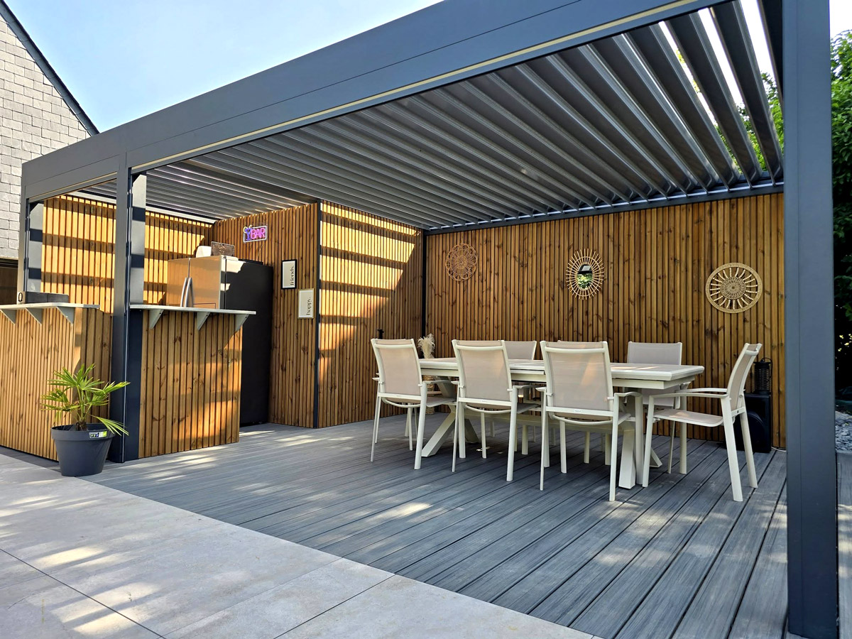 Installation d’une pergola bioclimatique Marquises avec terrasse en lames composites et bardage en bois 😎.
